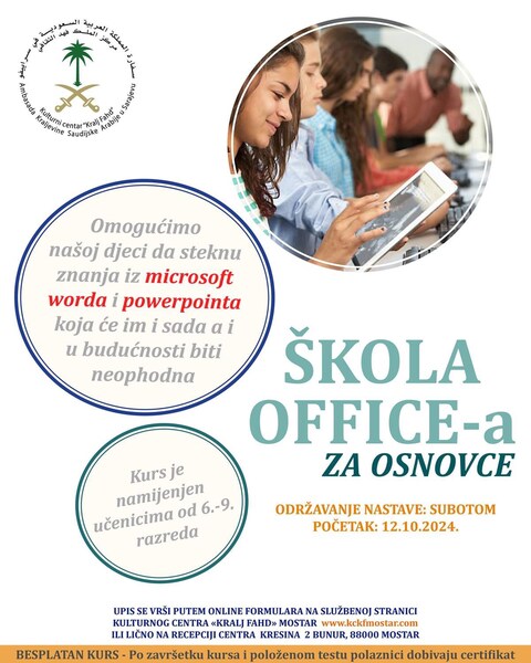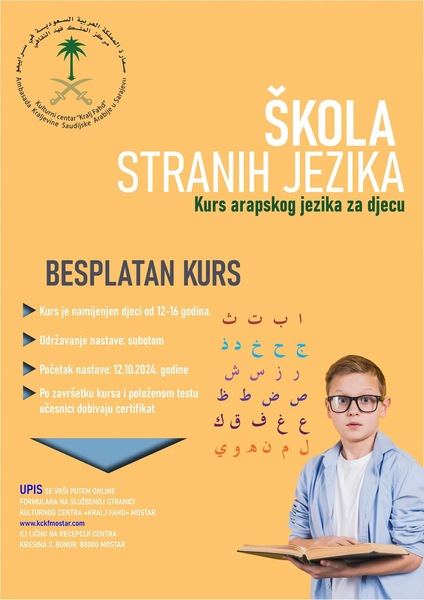 Odjel za edukaciju Kulturnog centra „Kralj Fahd”, Ogranak Mostar, obavještava da u ovoj školskoj godini, pored kursa Škola Office-a za osnovce, nude i novi kurs - Arapski jezik za djecu.