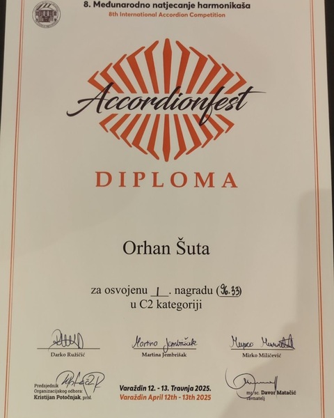 Orhan je pobjednik C2 kategorije na 8. Međunarodnom takmičenju harmonikaša Accordionfest održano 12-13. aprila u Varaždinu.