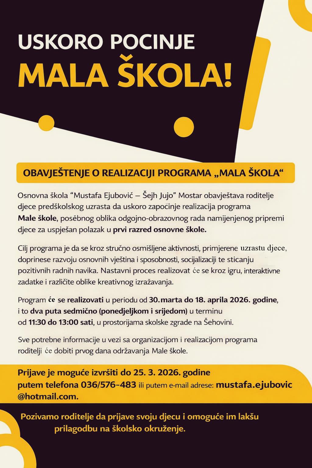 Program Male škole predstavlja važan segment tog rada, kroz koji djeca predškolskog uzrasta imaju priliku da se, na njima blizak i prirodan način, upoznaju sa školskim okruženjem, razvijaju socijalne i komunikacijske vještine te stiču prve radne navike.