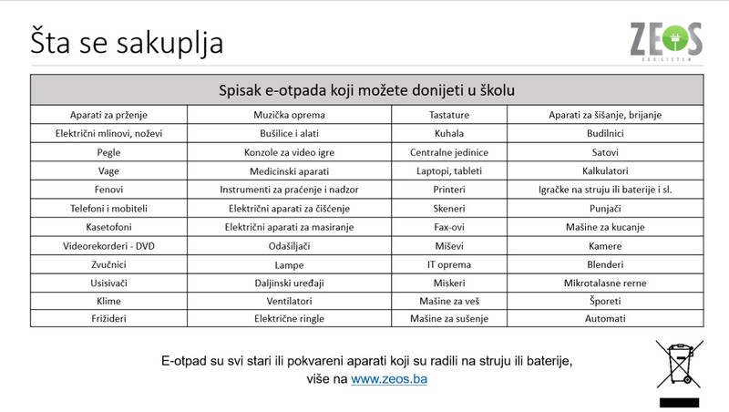 Na slikama u galeriji možete vidjeti šta se sakuplja, a na linkovima u prilogu možete vidjeti vijest o petom Međunarodnom danu e-otpada koji se obilježava danas, kao i urađene priloge i prezentacije ZEOS eko-sistem tima.