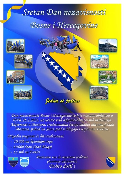 Dan nezavisnosti BiH bit će svečano obilježen u HNK 28. 2. 2023. uz učešće svih odgojno-obrazovnih institucija. Dobro došli!